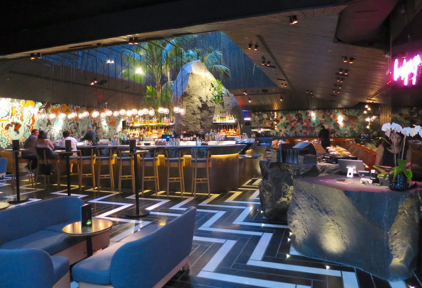 Housed in a stunning, seductive setting, Chotto Matte compels your sensations to recalibrate and reconsider what they are experiencing. The visual stimulation moves you from the v-shaped entry, to the wrap around bar, to the open-air roof, to the vibrant wall art, to the food prep stations into every nook and cranny–including a restroom area so startling that you need an attendant to guide you through.