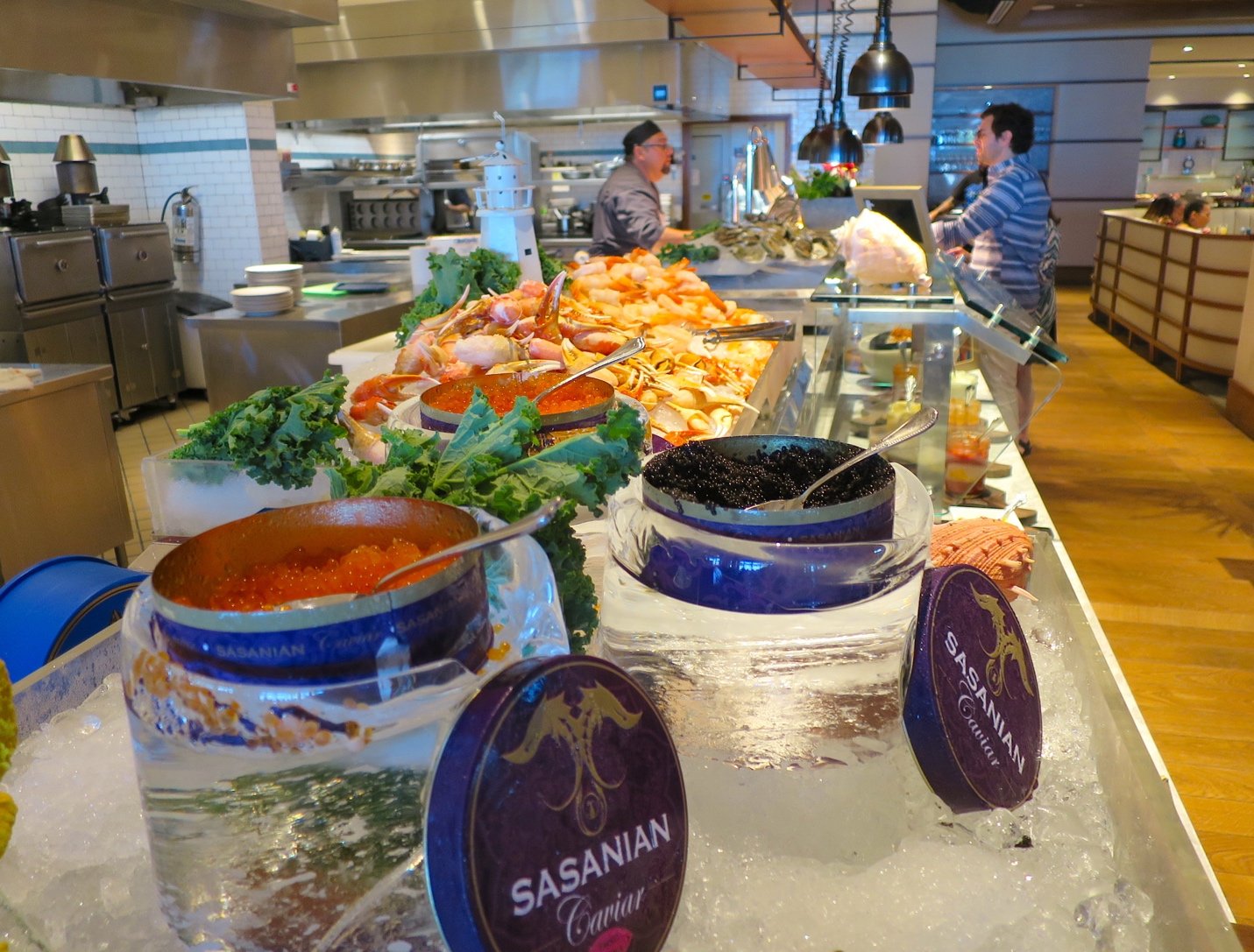 Among the always available temptations are sushi, oysters, shrimp, salmon, crab claws and caviar. Take your time as this feast lasts until 4:30 PM. The price includes all manner of beverages including Bloody Marys, Spiked Punch, Sangria, Prosecco, and more.