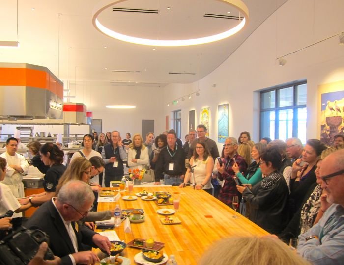 Saturday morning started with artisan bread toasted and paired with local toppings. Then it was on to a choice of “Cooking Italian” or “Global Street Food” in the newly opened Hestan Kitchens or digesting an “Asian Cooking Demo” with tips, techniques and ingredients shared by Chef Hilary Sullivan, followed by an informative wine tasting of “California Up and Comers: 5 Regions You Should Know,” led by CIA Sommelier Shannon Latting. A bountiful buffet lunch–composed of menu items that were practiced by the cooking participants and another round of breakout sessions ensued. Our choices included “Hands-On Preparation of Healthy Snacks,” or “Rustic Bistro Classics,” a demo of “Better with Butter Pies and Tarts” or a “Potato Chip and Wine Pairing,” presented by Ray Isle, Executive Wine Editor, Food and Wine. With new knowledge and full bellies, we adjourned until the evening repast called “Chef’s Table: California Bounty Dinner.” With Mumm Napa Rose Sparkling Wine in hand and passed appetizers on offer, we strolled the Hestan Kitchens observing the CIA chefs preparing our evening feast. The local beets, grass-fed beef, and panna cotta dessert were paired with premier Napa Valley Wines.