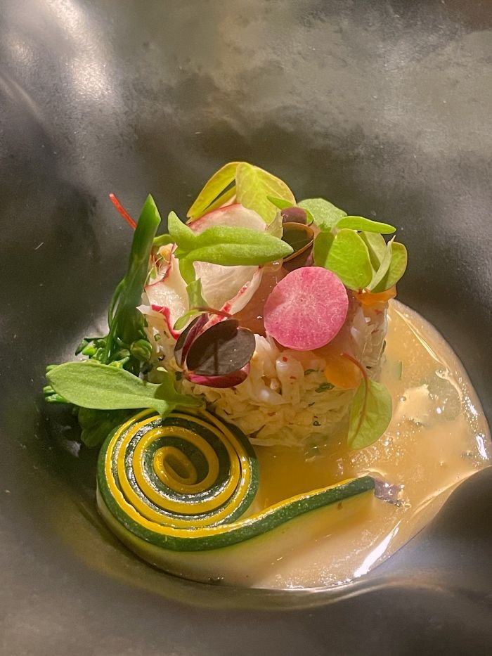 The cuisine is classic French using local, seasonal ingredients with a modern interpretation. The excellence of preparation, presentation, wine service and attentive staff all explain the awarding of a Michelin star in 2022.